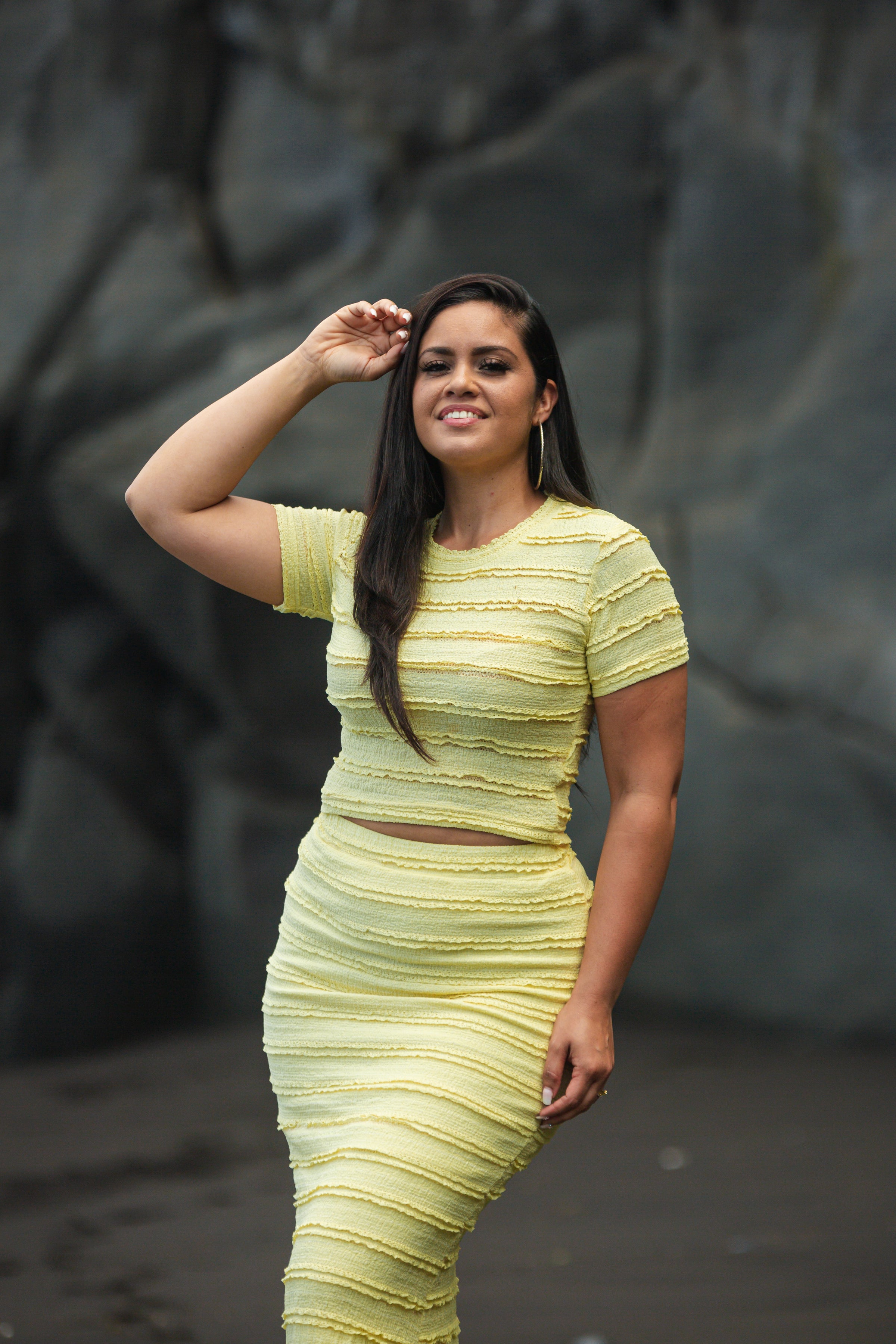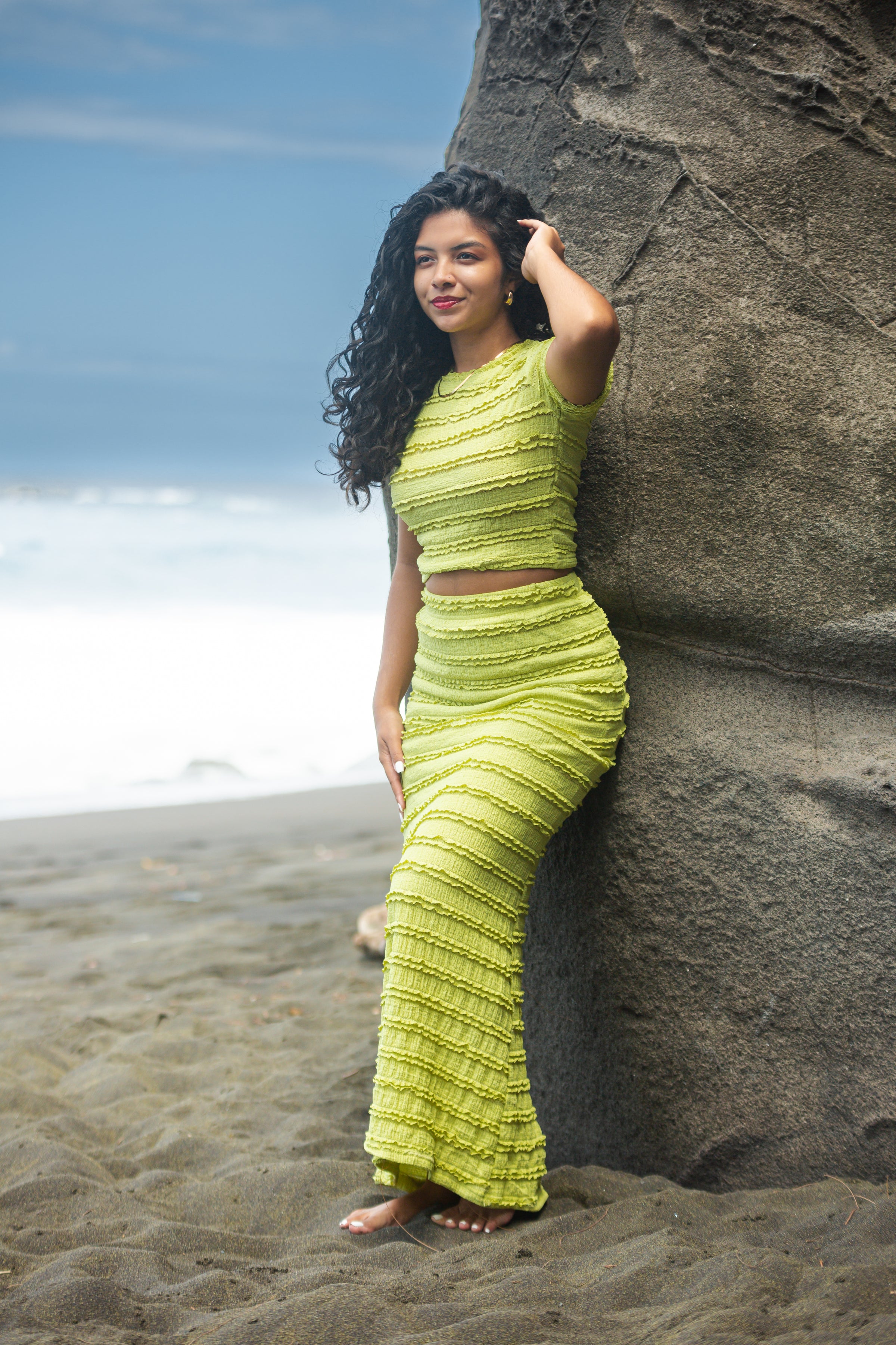 Découvrez l'ensemble Ana, composé d’un top à manches courtes et d’une jupe longue ajustée, avec sa matière texturée à volants horizontaux. Sa coupe près du corps sublime la silhouette tout en restant confortable et facile à porter