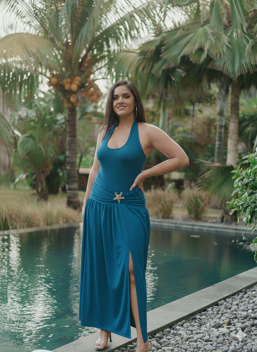 La taille est soulignée par un drapé fluide, resserré à l’avant par un ornement doré en forme d’étoile de mer, donnant immédiatement un esprit chic et balnéaire. Légère et aérienne, dotée d’une fente latérale qui apporte mouvement et sensualité tout en restant raffinée.