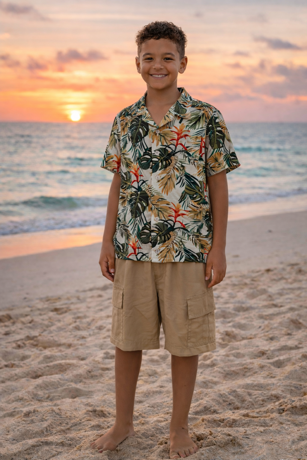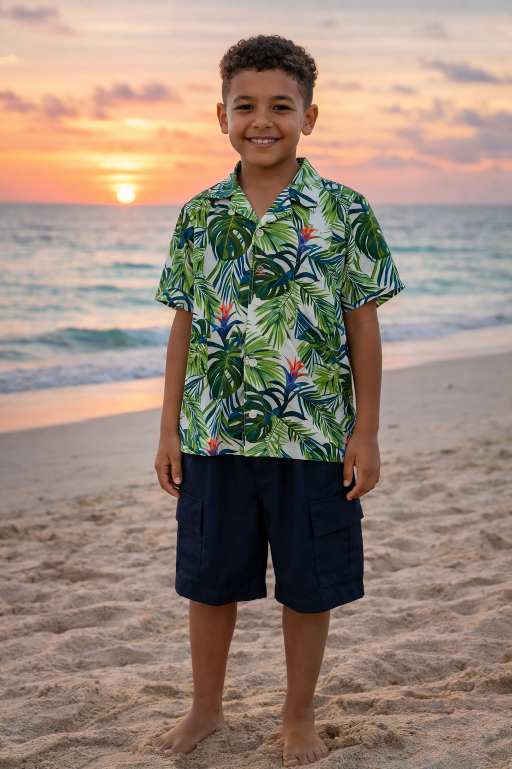 Ensemble Short Ryan : la tenue parfaite pour votre petit garçon ! Composé d'une chemise à manches courtes ornée d'un motif feuille et d'un short assorti, cet ensemble allie style et praticité. La chemise dispose d'une petite poche intégrée, tandis que le short offre deux poches spacieuses sur l'avant pour ranger les petits trésors de votre enfant. Confortable et élégant, cet ensemble est idéal pour les journées en famille ou les sorties décontractées. Une garde-robe incontournable pour les jeunes garçons en quête de style !